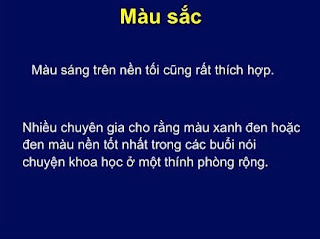 Nếu hội trường rộng, nên chọn màu chữ sáng (màu vàng, trắng) trên nền tối (màu xanh đậm). Nếu hội trường nhỏ hay trung bình, nên chọn chữ màu đậm (xanh đậm hay đen) trên nền sáng (màu trắng).
